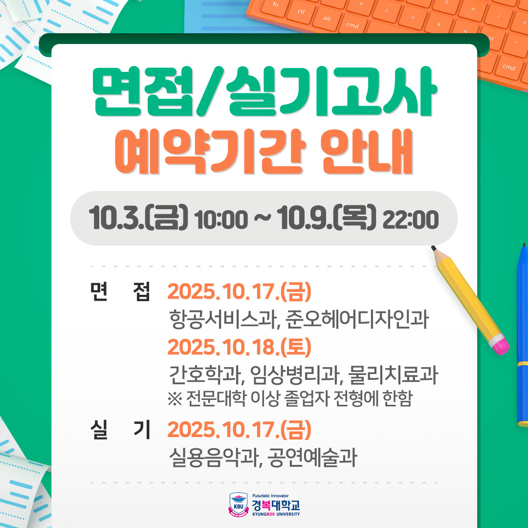 수시1차 잠재력을 전문가로, 경복대학교 수시1차 수시1차 모집요강 입시일정 입시결과 원서접수 지원현황 공지사항 입학상담 입시일정 2581년 2582 2583년 전체 01월 02월 03월 04월 05월 06월 07월 08월 09월 10월 11월 12월 월간일정 연간일정 2582년 12월 학사일정 달력으로 일별 일정 제공 일 월 화 수 목 금 토 SUN MON TUE WEN THU FRI SAT 1 2 3 4 5 6 7 8 9 10 11 12 13 14 15 16 17 18 19 20 21 22 23 24 25 26 27 28 29 30 31 상기 일정은 사정에 따라 변경 될 수 있습니다.